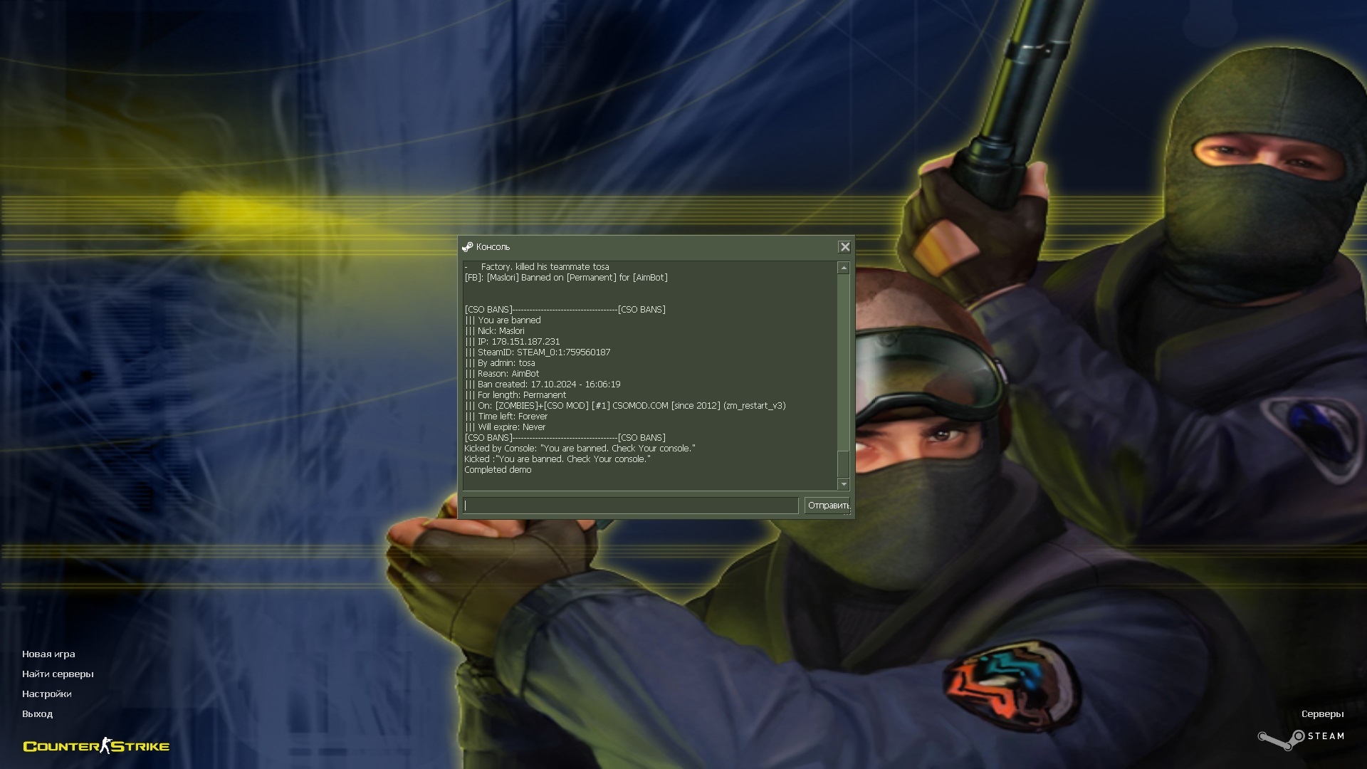 - Your ip and steamID: IP: 178.151.187.231 SteamID: STEAM_0:1:759560187
