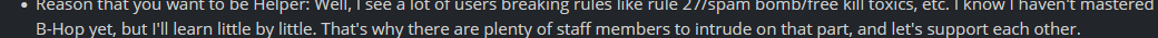 - Reason that you want to be Helper: Well, I see a lot of users breaking rules like rule 27/spam bomb/free kill toxics, etc. I know I haven't mastered B-Hop yet, but I'll learn little by little. That's why there are plenty of staff members to intrude on that part, and let's support each other.