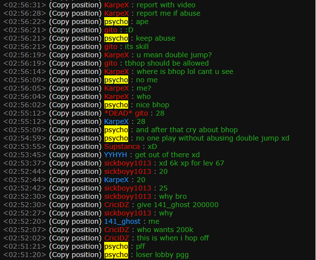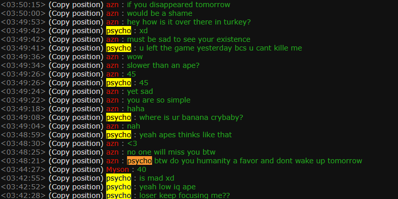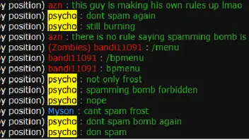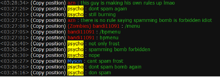 I have attached two screenshots of my interactions with the toxic player Psycho. In the first attachment labeled "Psycho Chat Log 2" he is making blatant rules that are not stated in the server rules where he is complaining about player Myson using the napalm grenades repeatedly while running away. This player is trying to control the actions of other players without fulling know the rules himself and interprets them to prohibit actions of other players that are completely legal. Furthermore, he is not a helper or an admin and he asserts himself in that position, I have seen him to do this multiple other times in the past few weeks but this is one example of him doing so. In the second screenshot labeled "Psycho chat log" he clearly provokes me first calling me a low iq ape which was totally uncalled for, and he clearly omitted this information in his report to make himself look in the right. I do not go out of my way to provoke others or insult them but I will not sit idly and let some random stranger on the internet attempting to belittle me into some inhuman creature.