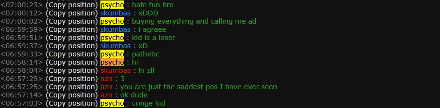 In addition, I have added two more screenshots from the chat log, like I mentioned in my previous comment, this player is always the one to provoke others first and instigates the fight. Then he goes on the forum to play the victim and cry about him getting bullied when he is the reason why other players don't like him in the first place. I am trying to just play my game after work and have some fun, but he wants to be some tryhard crybaby child that likes to poke at other people. He is always trying to control others with powers that he doesn't possess.