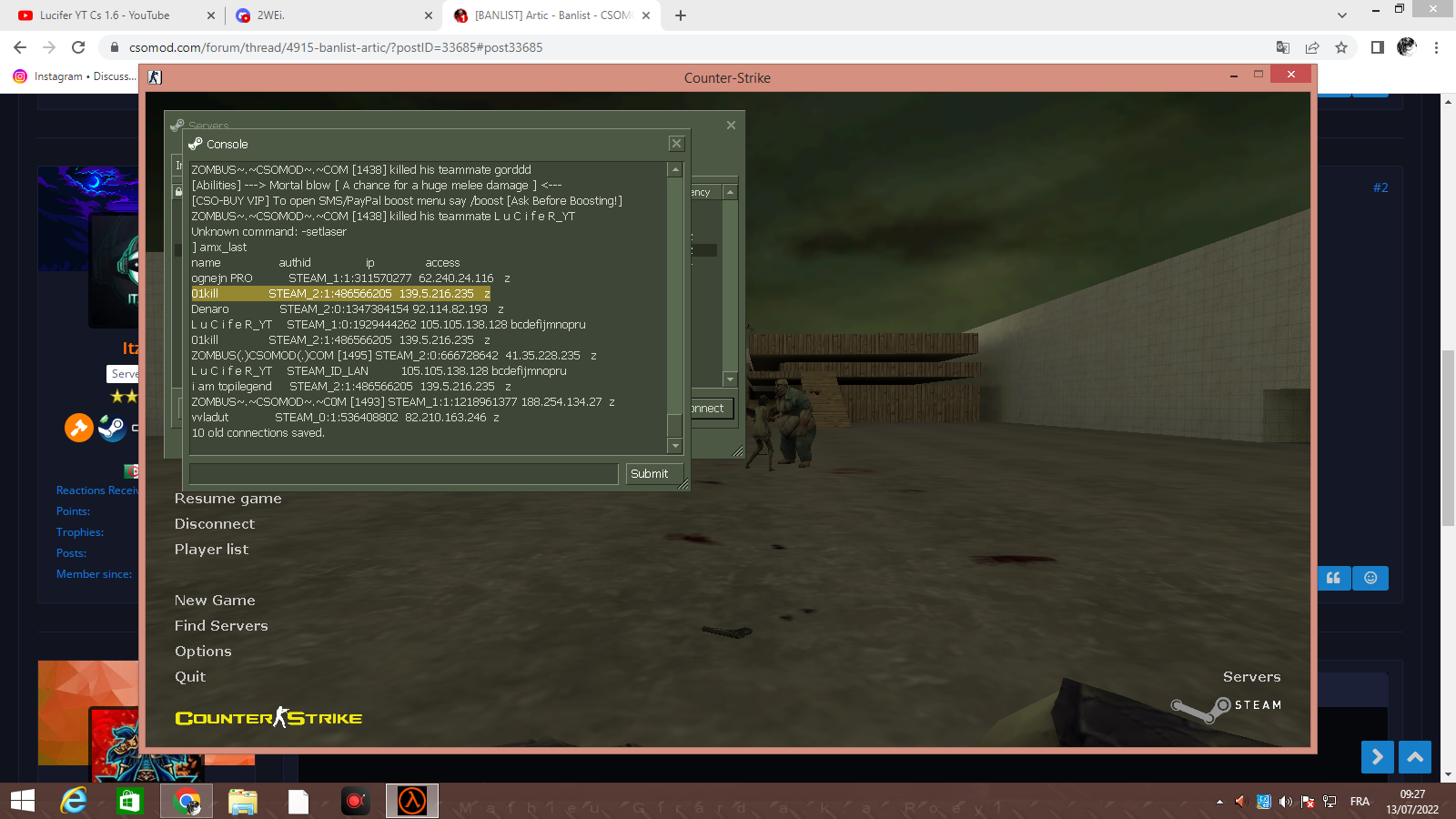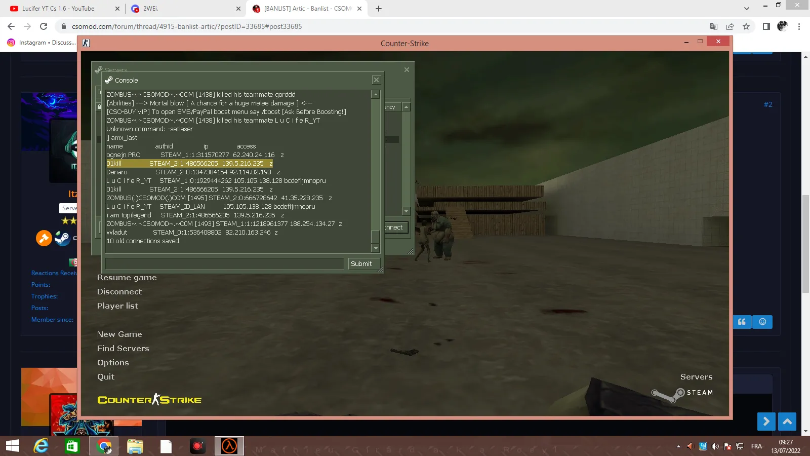 L 07/10/2022 - 10:16:15: <BAN> < AuthID:"STEAM_1:1:1212078181" , IP:"41.200.180.149" , Name:"01kill" > BANNED Permanently from the Server BY < RCON/Server >. [ BanType - "STEAMID" ] [ Reason - "speedhack" ]