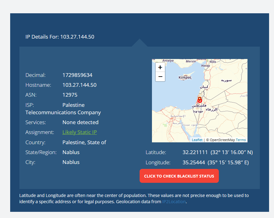 His IP "103.27.144.50" , proof that it shows he is from Palestine.