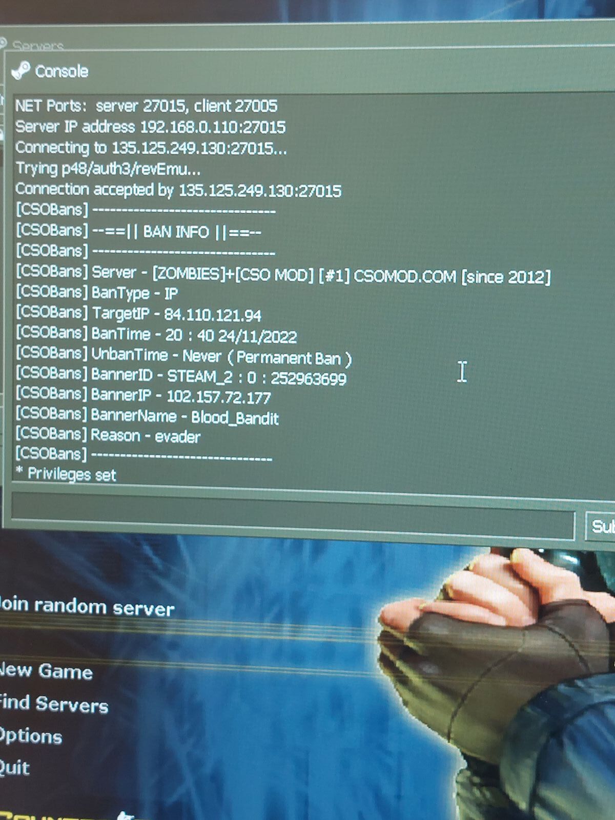 Your ip :102.157.72.177 or / STEAM_2 : 0 : 252963699