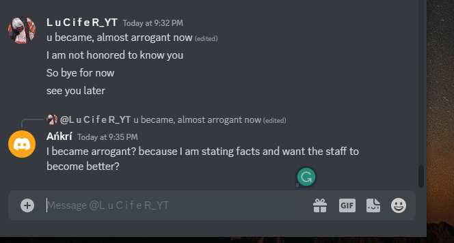 - Reason of complaint: Misinformation, disrespecting a moderator and being arrogant in the server, and swearing.