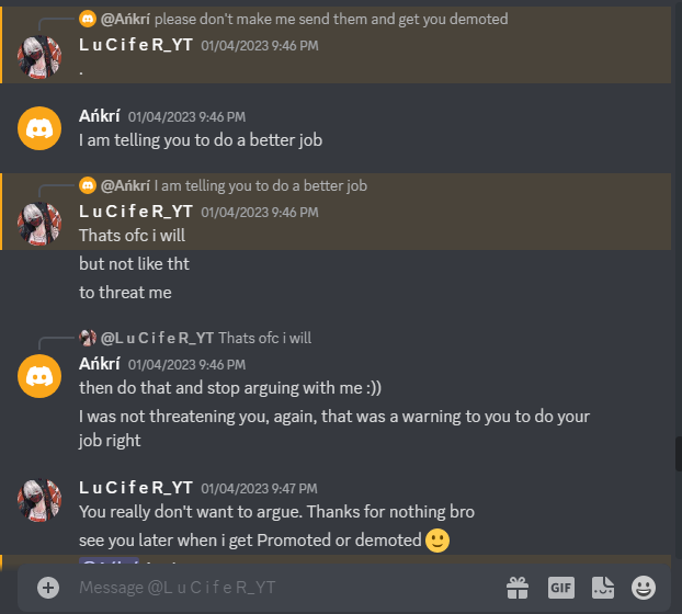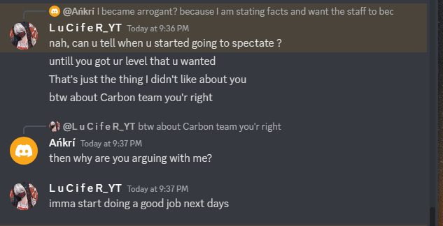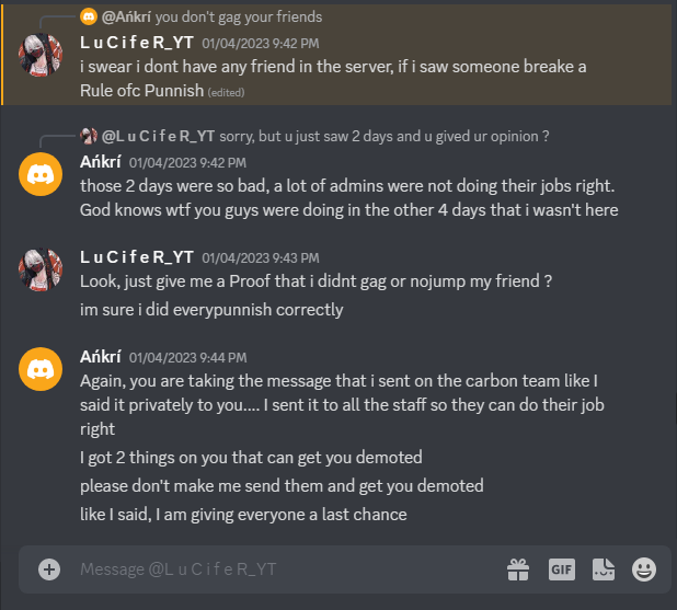 The statement from this player (PS) above states that "Why is this guy appointed as moderator", Instead of Lucifer defending me or at the very least staying neutral, he agrees with him and asks again "Why is this guy appointed with xd" Basically laughing at me and saying he's a paid moderator. After that PS states that I destroyed the server (He was mad that I gagged his friends). and Lucifer in the Admin chat laughs at me. (If you do not believe that these admin messages are directed to me, Only me, Lucifer and Mazen were in the server at that time and Mazen was afk). So instead of siding with the staff team and backing them up, you side with your friend who was clearly in the wrong.