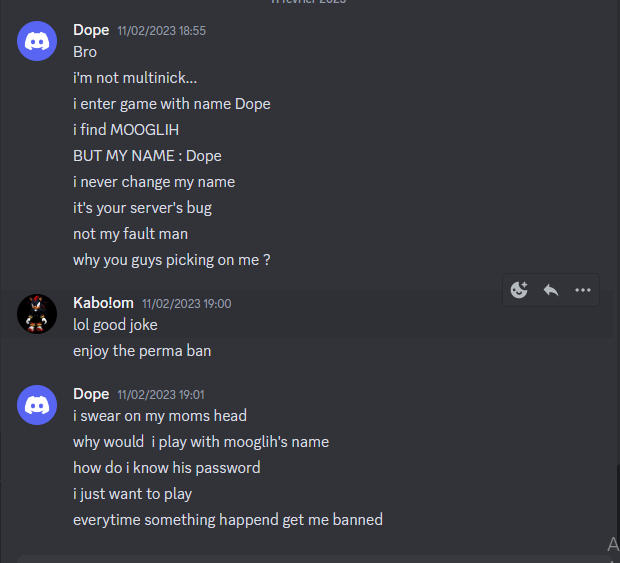 Guys ask Basehead , Flame , i just entered i found my name MOOGLIH other admins have proof , i did swear on my mom's head , because i already got down 60 levels for multinick i didn't read rules , now i'm aware of everything i didn't repeat it . Please consider my post