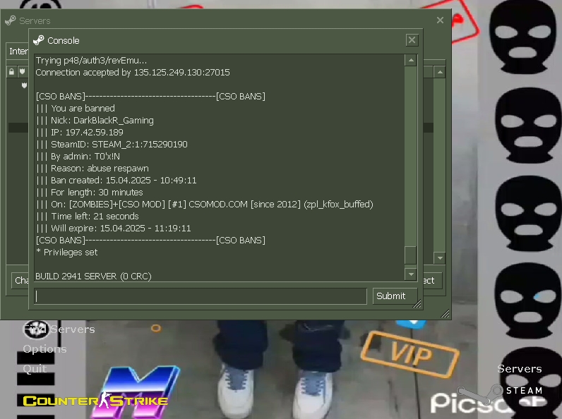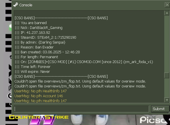 - The reason of ban:Respwan i get out from game and i playing again | i have pc ram 4 and i use win 7 and The game stops suddenly because my device is weak, and I enter the game again and enter the csomod server, and the admin bans me for 30 minutes, and my device is weak, and the game stops