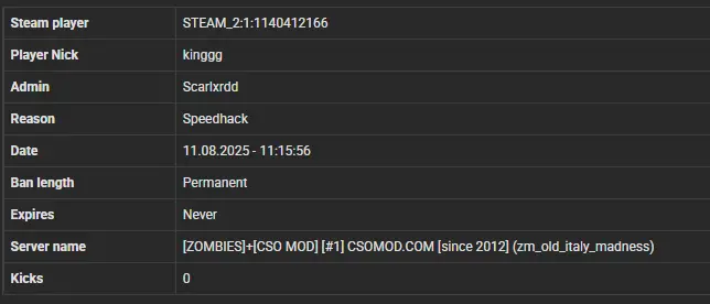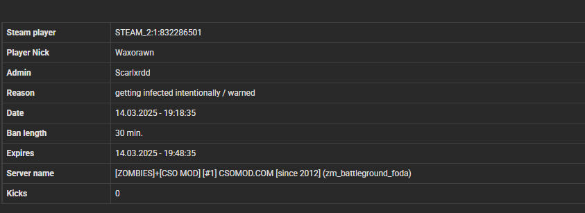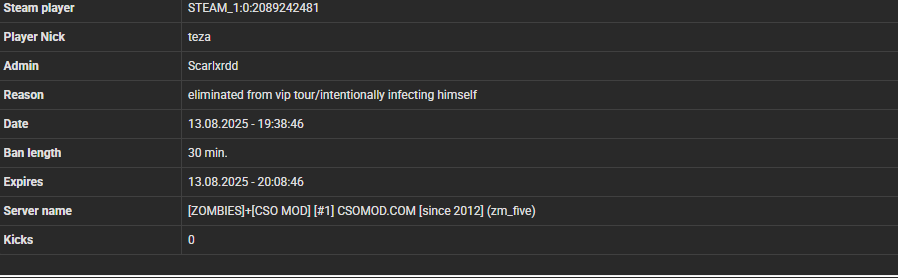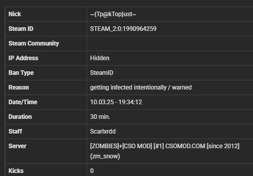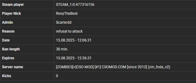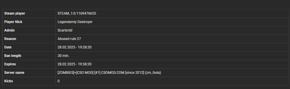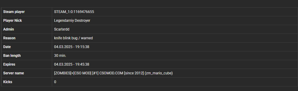 Legendarniy Destroyer STEAM_1:0:1169476655 87.126.208.48 z (missclicked for 1 day , Its fixed now)