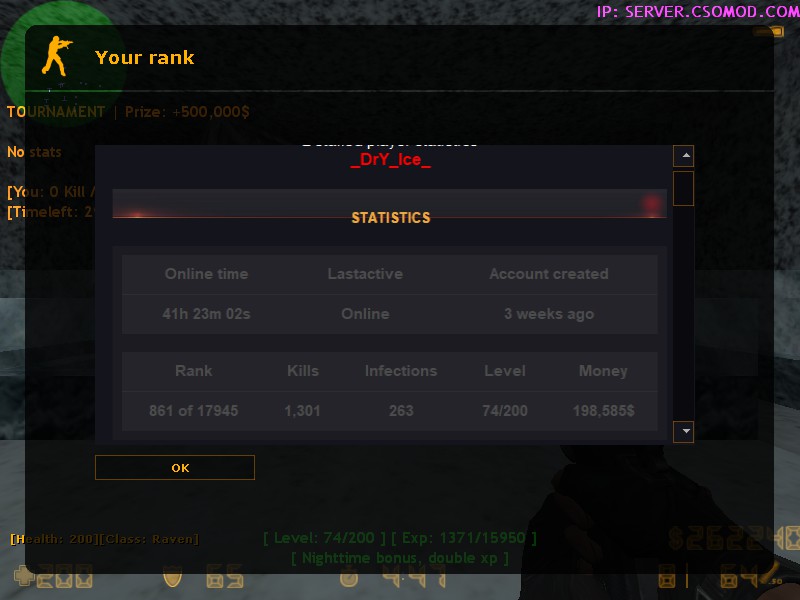 • Link of hours you playedon server on https://www.gametracker.com/pl…/server.csomod.com:27015/