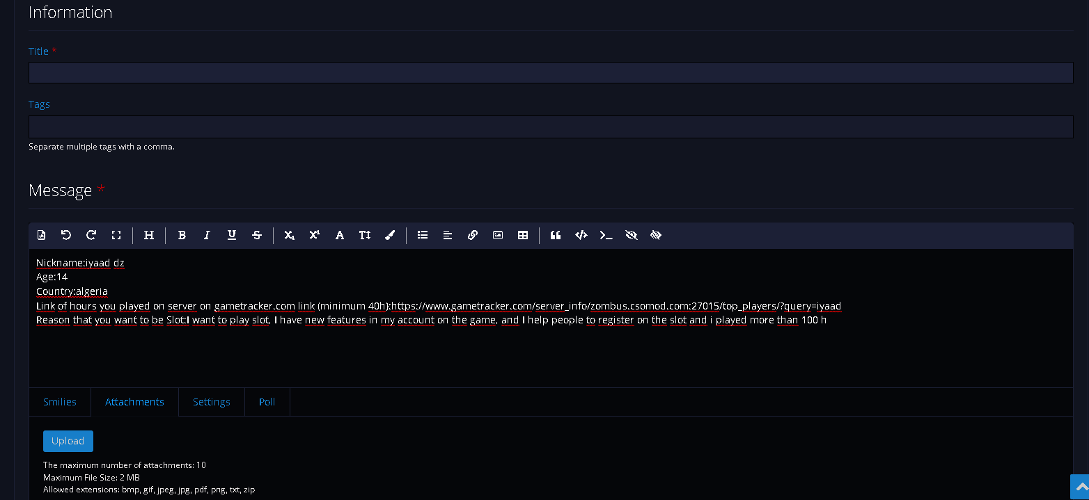 Link of hours you played on server on gametracker.com link (minimum 40h):https://www.gametracker.com/server_info/zo…rs/?query=iyaad