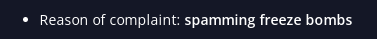 - Reason of complaint: spamming freeze bombs