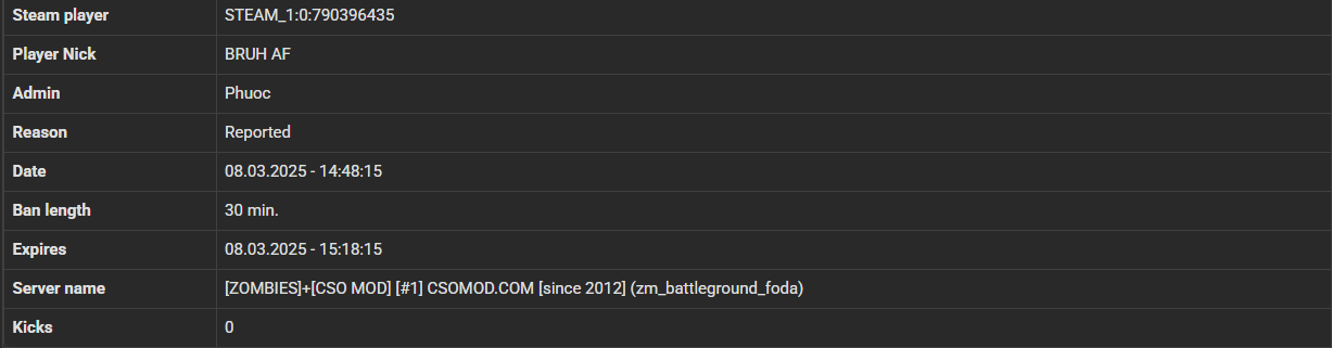 [FB]: [BRUH AF] Banned on [30 minutes] for [Reported] -