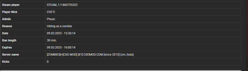 [FB]: Player [Dirowts] will be banned for [Teaming] on [30 minutes] -