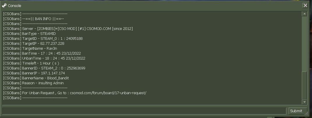 I was, literally, connected for no more than 20 seconds, I have no idea what you are talking about. Maybe it was something I said to you in the past? If that is the case than I am NOT sorry because whatever I said, I said it for a reason. Nevertheless I see no reason for the ban so I will not humiliate myself apologizing for someone else's incompetent decisions on a "pay to win" server. There are a lot of issues on the server and a lot of discrimination (with or without admins online) so I won't even go into details because I hate shouting to deaf years. No, I am not the age you think I am, and yes, I have administered (admin) numerous servers for years so I am no stranger to either abuse or incompetence.