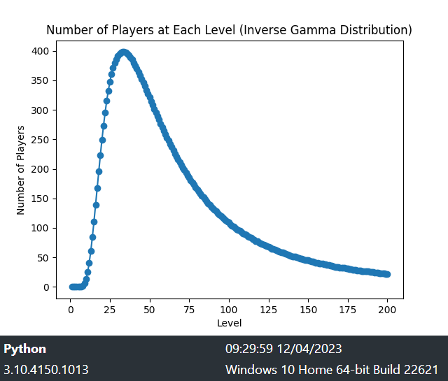 As I don't know what kind of distribution the levels of the players follow, I made a small script for 27.000 players with random levels that follow an inverse Gamma Distribution from 1-200. This is the distribution that the server should follow such that it will encourage low-level players to level, and discourage high-lvl players to have access to a lot of overpowered weapons.