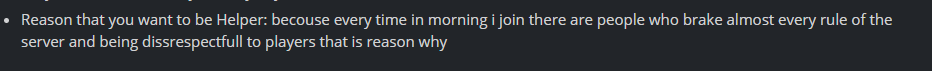 As a helper u doing so much better then me and I always thought that u have to be an admin u basically know what you doing and always active helping player with everything u could and u are a good respectful guys idk if my vote as a helper count but u really deserve it +1