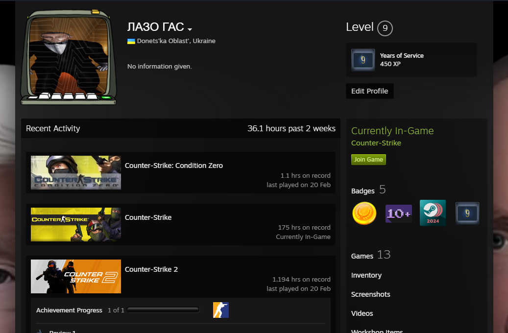 Steam profile link: https://steamcommunity.com/profiles/76561198199155778