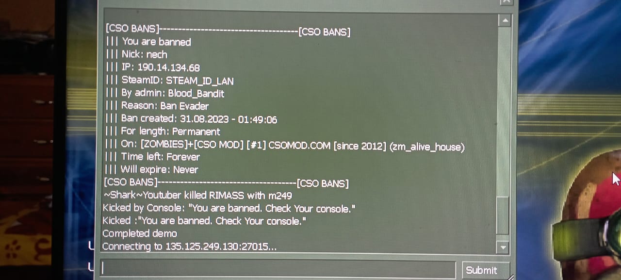SOLICITUD DE DESBANEO David Cua September 1, 2023 at 3:21 AM Apodo: nechTu dirección IP: 190.14.134.68El motivo de la prohibición: Ban Evader no se que es esoAdministrador que te baneo: blood_banditPrueba (captura de pantalla de tu consola):