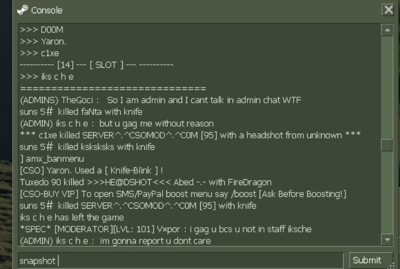 [CSOBans] iks c h e has been BANNED for 30 Minute(s) BY V¤por. [ Reason - "talking in admin chat" ]