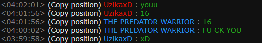 - <04:05:09> (Copy position) UzikaxD : FUCK YOU